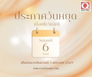 บริษัท ควอลิตี้ เซอเคิล จำกัด ขอเรียนแจ้งลูกค้าและคู่ค้าที่เกี่ยวข้องทุกท่าน บริษัทฯ จะปิดทำการวันหยุดชดเชยวันจักรีในวันจันทร์ที่ 6 เมษายน 2569 และจะเปิดทำการปกติอีกครั้ง ในวันที่ 7 เมษายน 2569 โดยทางลูกค้าและบริษัทคู่ค้า จะยังสามารถติดต่อสอบถามผ่านช่องทางออนไลน์ได้โดยอาจมีความล่าช้าในการตอบข้อสงสัยหรือแจ้งราคาเนื่องจากวันหยุดยาวค่ะ