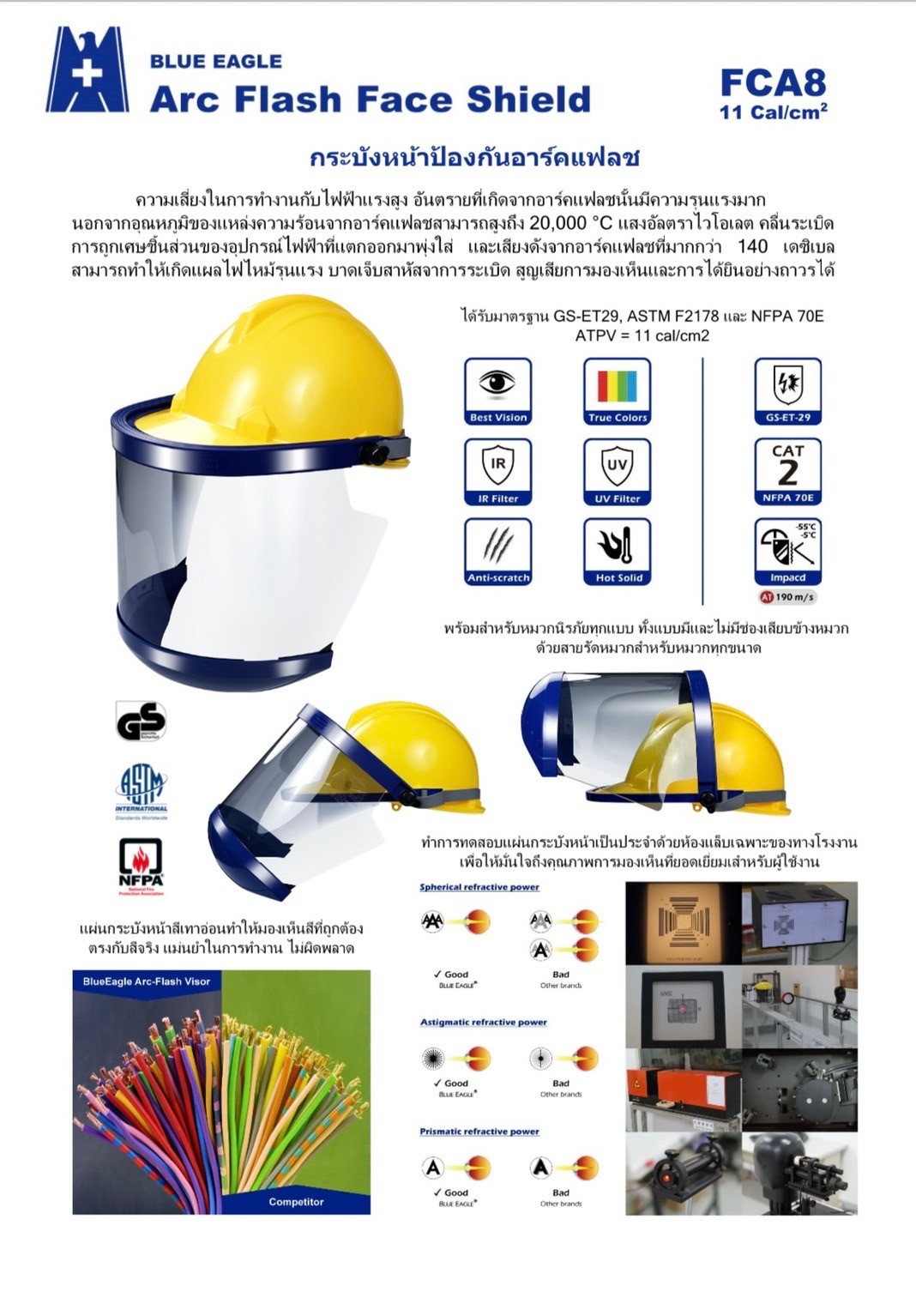 - กระบังหน้าชิ้นนี้ได้รับการออกแบบเพื่อใช้ป้องกันจากอันตรายที่เกิดจาก Arc Flash ซึ่งมีค่าพลังงานไม่เกิน 11 แคลลอรี่ต่อตารางซม.