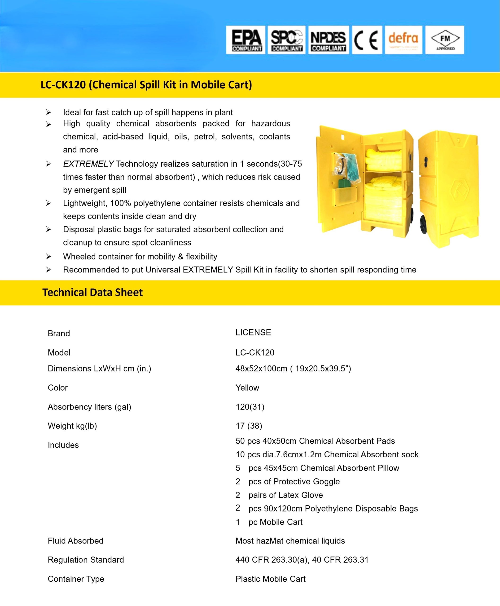 ชุดดูดซับสารเคมีฉุกเฉินแบบรถเข็น รุ่น LC-CK120 (Chemical Spill Kit-Mobile Cart) สีเหลือง *ดูดซับสารเคมี-กรดด่าง-น้ำมัน*