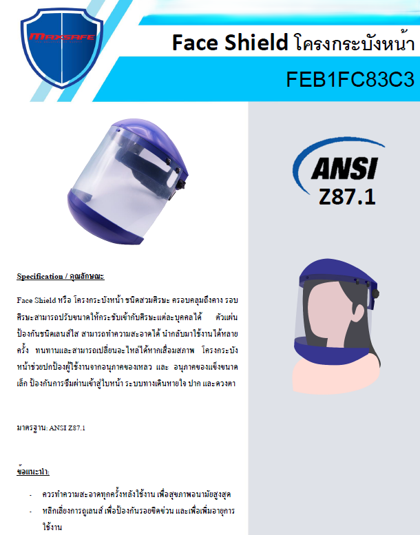 - ส่วนกระบังหน้าเลนส์ใส รุ่น FC83 ผลิตจากโพลีคาร์บอเนต หนา 1.0 มม ขนาด 20*39 ซม. เพิ่มความปลอดภัยให้กลับใบหน้าและดวงตา