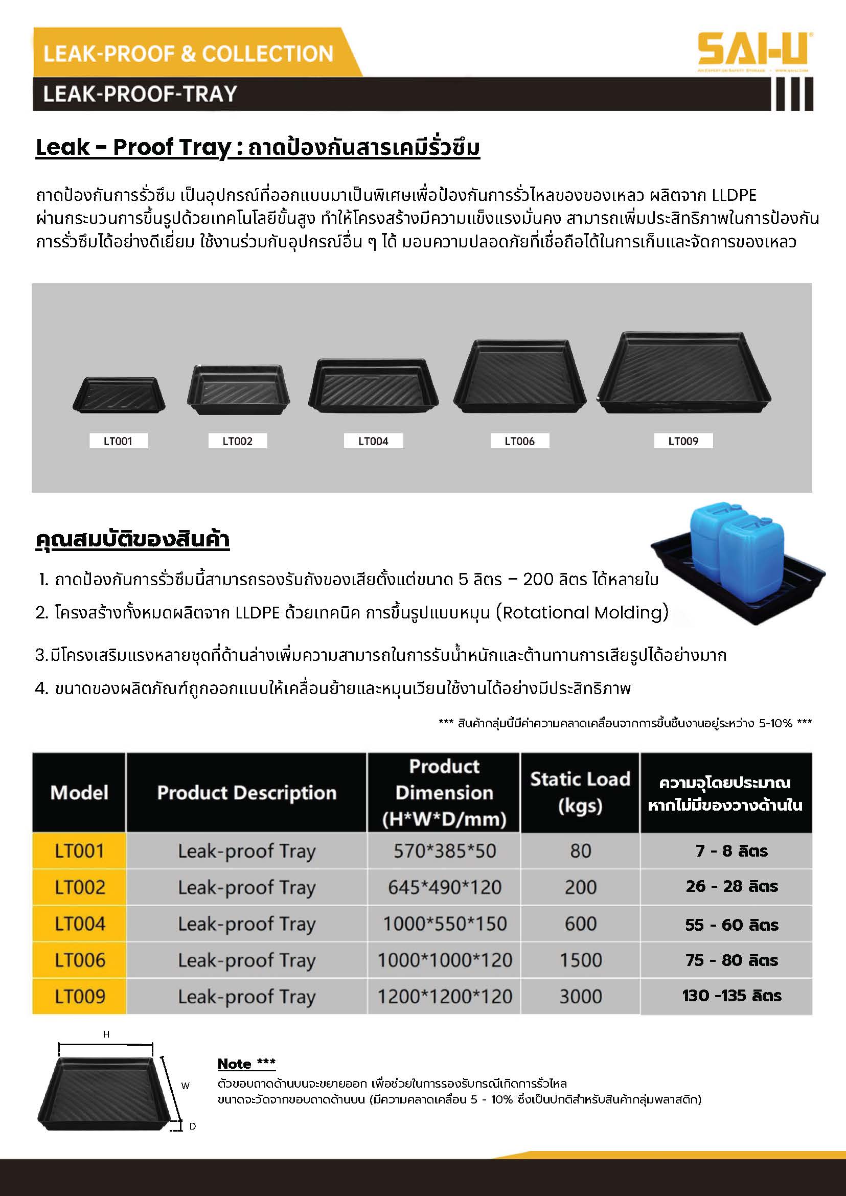 - ถาดป้องกันการรั่วซึมนี้สามารถรองรับถังของเสียตั้งแต่ขนาด 5 ลิตร – 200 ลิตร