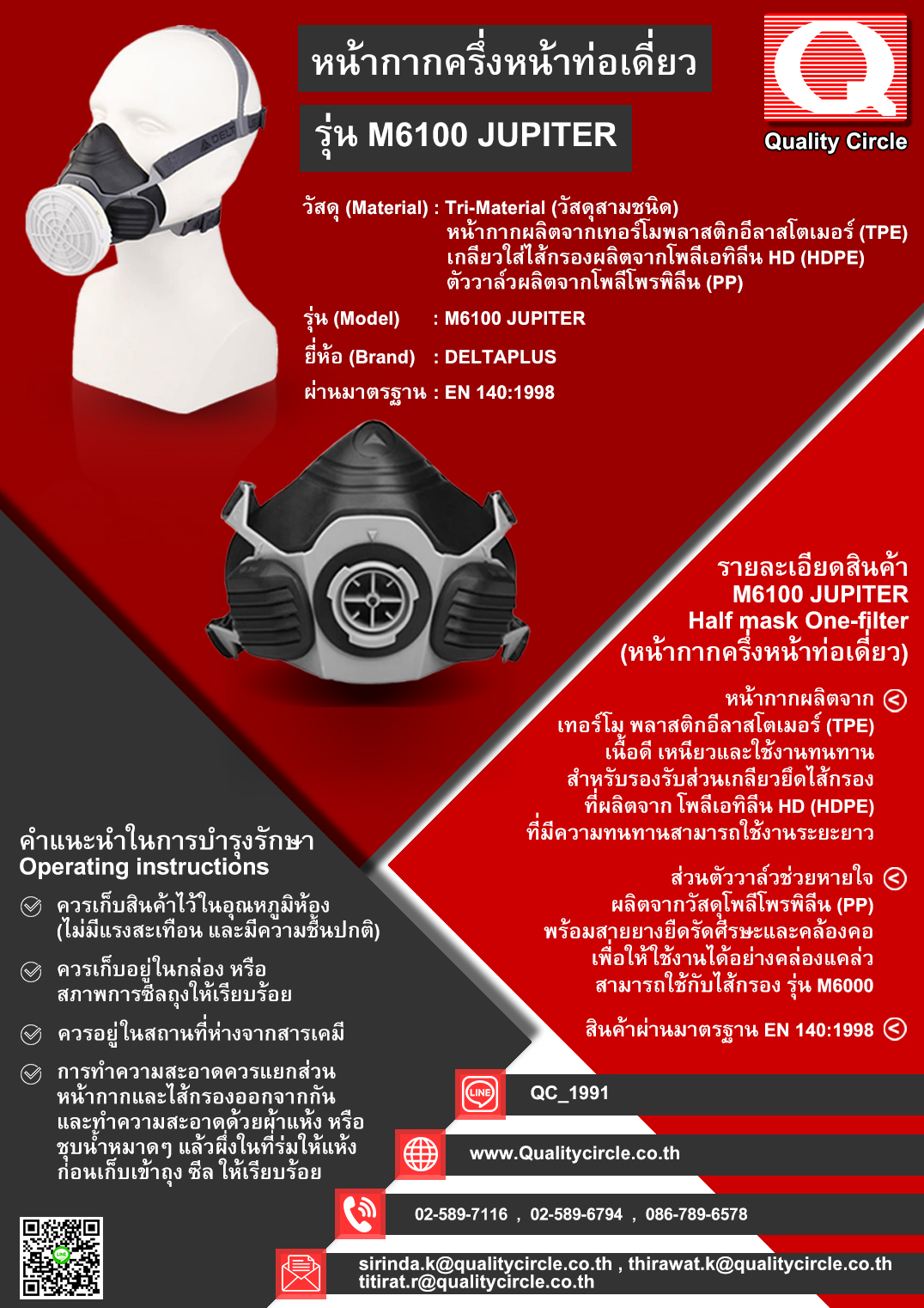 M6200 JUPITER Half mask Bi-filter (หน้ากากไส้กรองคู่) : หน้ากากผลิตจากเทอร์โมพลาสติก (TPE) เนื้อดี เหนียวและใช้งานทน ส่วนเกลียวยึดไส้กรองผลิตจาก โพลีเอทิลีน HD (HDPE) ป้องกันการเปราะแตกจากการใช้งานระยะยาว ตัววาล์วช่วยหายใจผลิตจากวัสดุโพลีโพรพิลีน (PP) พร้อมสายยางยืดรัดศีรษะและลาคอเพื่อให้ใช้งานได้อย่างคล่องแคล่ว สามารถใช้กับไส้กรอง รุ่น M6000 สินค้าผ่ามาตรฐาน CE0082