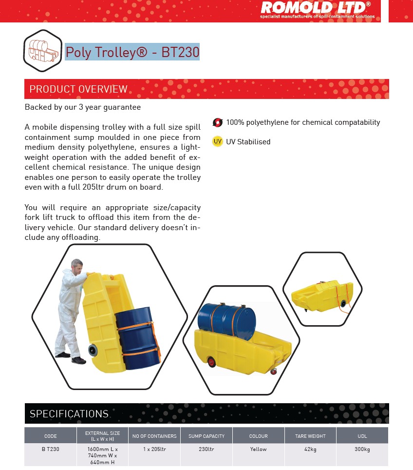 อุปกรณ์รองสารเคมีรั่วไหล่แบบรถเข็น สำหรับวางถังเคมี (แนบนอน) มีล้อ Poly Trolley® ROMOLD BT230