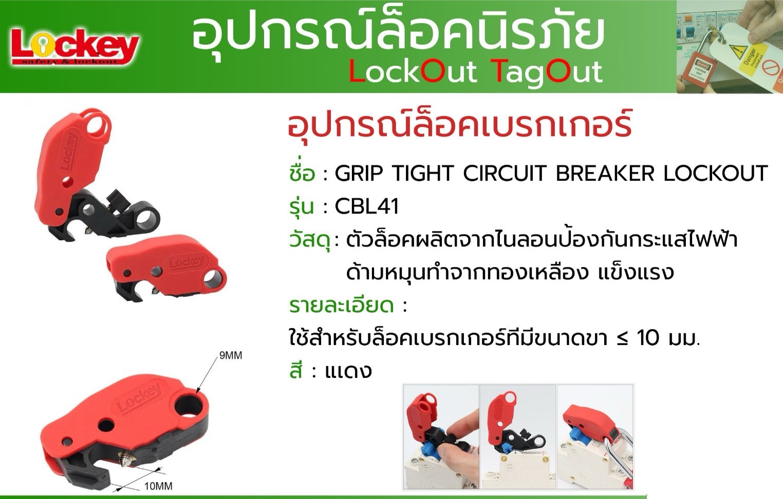 ใช้สำหรับล็อคเบรกเกอร์ที่มีขนาดขาไม่ เกิน10 มม. ใช้ล็อคเบรกเกอร์เมน ขนาดเล็กและกลาง