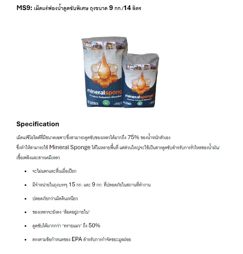 เม็ดแร่ฟองน้ำซีโอไลต์ (Mineral Sponge) สารดูดซับสาหรับการรั่วไหลของน้ามัน/เชื้อเพลิงและสารเคมีเหลว โดยสามารถดูดซับของเหลวได้มากถึง 75% ของน้าหนักตัวเอง ทำให้สามารถใช้งานได้ในหลายพื้นที่ และดูดซับเข้าซอก-มุมได้ทุกลักษณะงาน เหมาะสำหรับงานในโรงงานอุตสาหกรรม งานที่มีการรั่วไหลของสารเคมีหรือน้ำมันหรือของเหลวโดยทั่วไป