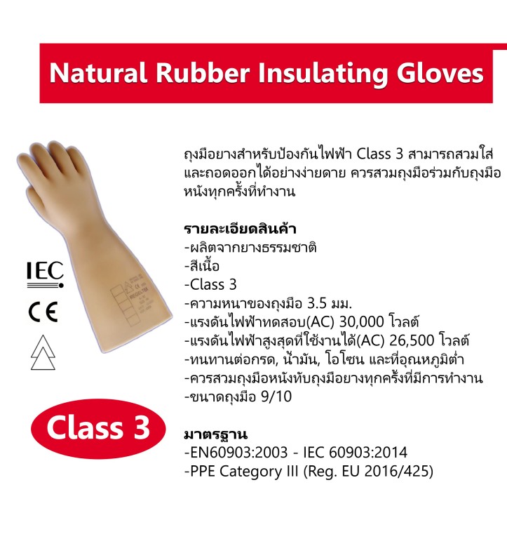 - Class 3 ป้องกันแรงดันไฟฟ้าใช้งานสูงสุด (AC/DC): 26,500 โวลต์ /แรงดันไฟฟ้าทดสอบ (AC/DC): 30,000 โวลต์