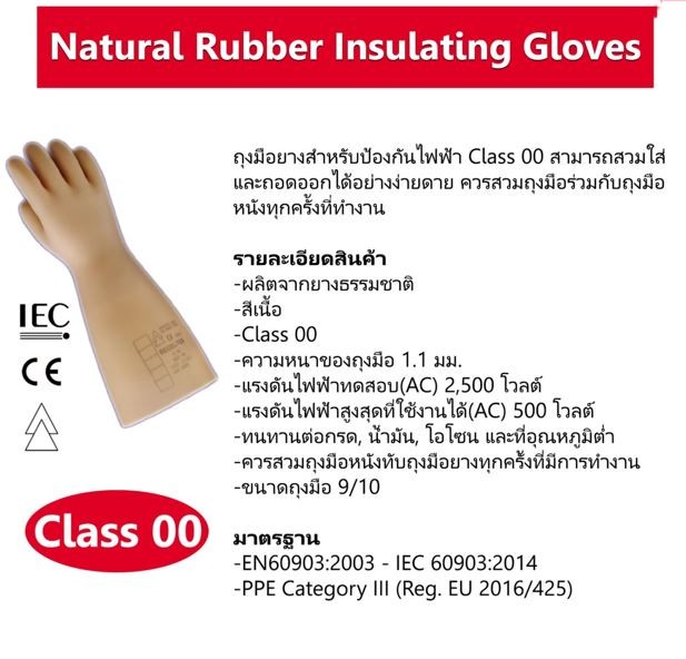 - Class 00 ป้องกันแรงดันไฟฟ้าใช้งานสูงสุด (AC/DC): 500 โวลต์ /แรงดันไฟฟ้าทดสอบ (AC/DC): 2,500 โวลต์