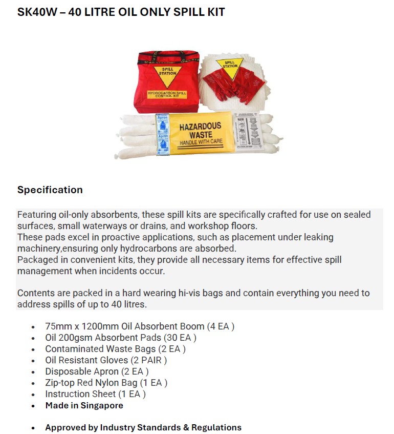 Specification Featuring oil-only absorbents, these spill kits are specifically crafted for use on sealed surfaces, small waterways or drains, and workshop floors.